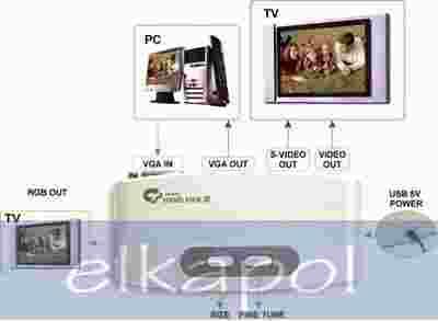 Zawartość opakowania: Urządzenie, instrukcja obsługi, kable: video, s-video, vga-vga, rgb-scart oraz kabel zasilający USB.