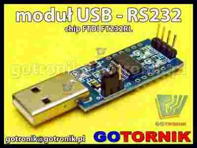 Moduł konwertera z USB na RS232 TTL oparty na układzie FT232RL produkcji FTDI. Moduł umożliwia podłączenie do komputera lub laptopa urządzeń wyposażonych w port RS232 w celu aktualizacji oprogramowania, sterowania lub pomiarów. Umożliwia on podłączenie do mierników elektrycznych, telefonów komórkowych, dekoderów, programatorów, tunerów satelitarnych, samochodowych interfejsów diagnostycznych, routerów np. Cisco, central alarmowych, GPS i wielu innych.