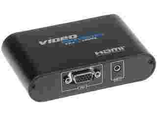 Przekształca sygnał VGA + dwa kanały audio (stereo) na sygnał HDMI. Pozwala podłączyć do najnowszych monitorów i telewizorów np. rejestratory, kamery, starsze laptopy, komputery, które nie posiadają złącza HDMI.