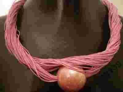 wykonany ze sznurka lnianego w kolorze różowym na który zapleciona została duża, błyszcząca, szkliwiona porcelanowa kula( ok.3 cm.) w kolorze brudnego różu