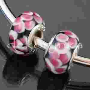 Koralik modułowy wykonany ze szkła. Przeznaczony do biżuterii modułowej, wielkość otworu około 5mm, wymiary około 13mm średnica, 9mm szerokość. Z metalową wkładką w środku (tulejka). Ze względu na wykonanie z naturalnych materiałów każdy koralik jest niepowtarzalny i może bardzo nieznacznie różnić się szczegółami wzoru. 1 sztuka. Tulejka posrebrzana srebrem próby 925.