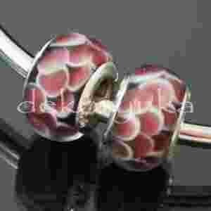 Koralik modułowy wykonany ze szkła. Przeznaczony do biżuterii modułowej, wielkość otworu około 5mm, wymiary około 13mm średnica, 9mm szerokość. Z metalową wkładką w środku (tulejka). Ze względu na wykonanie z naturalnych materiałów każdy koralik jest niepowtarzalny i może bardzo nieznacznie różnić się szczegółami wzoru. 1 sztuka. Tulejka posrebrzana srebrem próby 925.