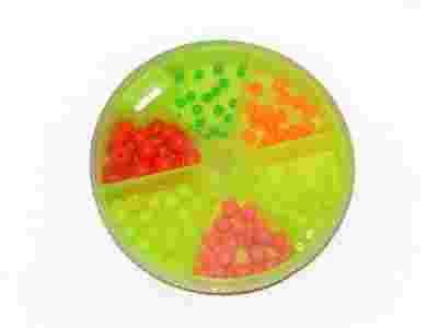 Zestaw koralików wykonanych z plastiku w różnych rozmiarach i kolorach. W opakowaniu znajdziemy sześć najczęściej używanych rozmiarów koralików,stosowanych we wszystkich metodach połowu.