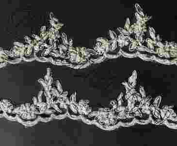kolorze śnieżno białym, ivory, ecru. Zdobiona koralikami. Szerokość 8cm (mierząc w prostokącie). Na innej naszej aukcji znajduje się ten model koronki tylko w wersji niezdobionej lub zdobiona srebrną nicią. Koronka jest doskonałym zdobieniem dodatków ślubnych: welonów, rękawiczek, bolerek, sukien ślubnych i komunijnych.