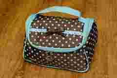w kolorze gorzkiej czekolady w błękitne groszki. Wnętrze kosmetyczki w ślicznym błękitnym kolorze