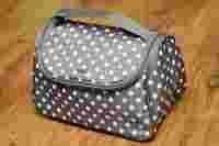 Piękna kosmetyczka - kuferek wykonana z nieprzemakalnego materiału w kolorze ciepłego beżu z różowymi groszkami. Pod klapką zapinaną na podwójny zamek znajduje się lusterko, a pod lusterkiem kieszonka z siateczki na zameczek. W komorze głównej gumki podtrzymujące buteleczki lub inne rzeczy oraz dwie kieszonki z materiału z gumką. Doskonały prezent dla każdej Pani.
