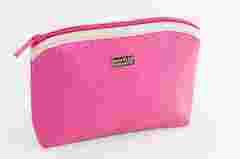 Śliczna kosmetyczka wykonana z nieprzemakalnego materiału przypominającego skórę węża w różowym kolorze.