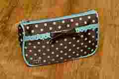 w kolorze gorzkiej czekolady w błękitne groszki. Wnętrze kosmetyczki w błękitnym kolorze