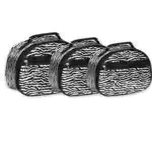 Elegancka kosmetyczka z uchwytem. Zapinana na suwak. Wewnątrz mieści 5 przegródek na akcesoria kosmetyczne z paskiem (na wieczku) oraz lustereczko na wstążce. Z boku kosmetyczka ma dodatkową kieszonkę na suwak. Dosyć spora, pomieści dużo kosmetyków (np. kolorówki) - świetna też na ozdoby do paznokci. Bardzo sztywna - ścianki ze sztywnego tworzywa, nigdy się nie odkształca. Zapinana na podwójny suwak. Wykonana z pięknej satynki we wzorek imitujący zebrę. Łatwa do utrzymania w czystości. Rewelacyjna na podróż.