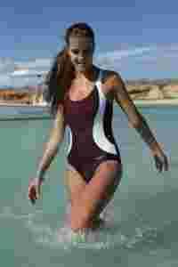 Kostium jednoczęściowy basenowy. Sportowy krój i fason. Na plecach okrągłe wycięcie. Panele w kontrastowych kolorach optycznie wysmukają sylwetkę. Przód od wewnątrz podszyto dla zwiekszenia komfortu użytkowania. Nie prześwituje po zmoczeniu