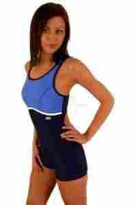 Kostium basenowy, jednoczęściowy, z szortami. Kostium z tyłu zabudowany. Wewnętrzny biustonosz. Z tyłu skrzyżowane ramiączka, plecy odkryte. Podwójne przeszycia na szwach, materiał - włoska lycra.