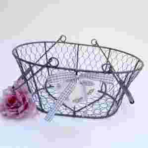 Kosz francuski S wykonany z metalu w kolorze ciemno brązowym ozdobiony białym serdeszkiem oraz tasiemką w szaro- białą krateczkę. Koszyczek posiada dwa uchwyty.