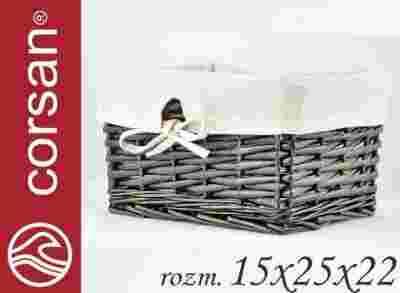 Stan: Nowy Materiał wykonania: wiklina Długość (dłuższy bok) w cm: 25 Wysokość: 15 [см] Szerokość (krótszy bok) w cm: 22 Kolor: beżowy, odcienie szarości