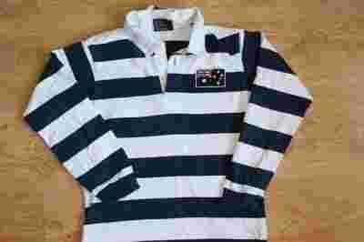 Wita mam do sprzedania koszulkę polo z długim rękawem na rozmiar 164.Koszulka zapinana na trzy guziki na przodzie małe logo flagi,a w tyle napis Australia.Kołnierzyk gładki z płótna z naszytą w tyle małą flagą.Rękawy zakończone granatowym ściągaczem.Koszulka do noszenia na wierzch po bokach małe pęknięcia.Nosi normalne ślady noszenia i prania ściągacze trochę wyblakłe stan oceniam na plus dobry.