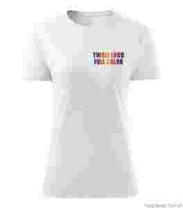 Koszulka z nadrukiem - technika termotransferu laserowego z wycinaniem po obrysie - jeżeli logo zawiera przejścia tonalne, jasne kolory proponujemy wydruk laserowy i wycinanie po obrysie.