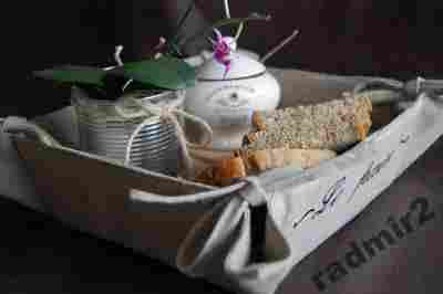 Tekstylny koszyk - dwustronny, uszyty z 100% jutowego lnu, kolor: beżowy. Wierzchnia część ozdobiona haftowanym napisem (haft maszynowy) w języku francuskim "Le pain" (chleb) - napis umiejscowiony na dwóch przeciwległych ściankach. Ścianki i spód koszyka wzmocnione zostały plastikowym tworzywem, dzięki czemu można go prać ręcznie. Wiązania wykonane z tego samego materiału - są przez to sztywne, i w odróżnieniu od wiązań z satynowych, bawełnianych tasiemek ładniej się prezentują. Wymiary: 20 cm x 20 cm x 9 cm (wysokość)