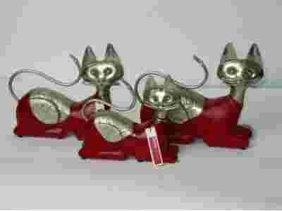 Figurki-rzeźby wykonane z egzotycznego drewna (LITE DREWNO)w kolorze ciemnej,przecieranej czerwieni, połączonego z metalem.Figurki - KOTKÓW - wykonane bardzo starannie i solidnie przez indyjskich rzemieślników - 80% ręczna praca. Bardzo efektowną ich częścią są okucia ze srebrzonego metalu oraz tzw."niemieckiego srebra"z pięknym wytłaczanym wzorem ( okute grzbiety kotków ).