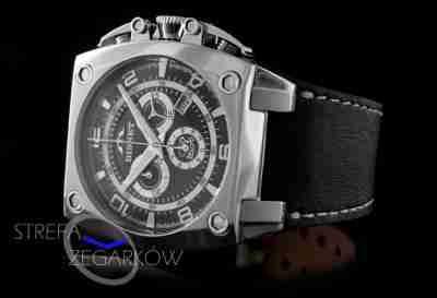 Czarna tarcza z ciemnymi tarczami dodatkowymi (ze srebrnymi ringami) . Koperta stalowa, polerowana. Pasek czarny. Ringi tarcz pomocniczych są polerowane co daje ciekawy efekt w połączeniu z czarnymi matowymi środkami. Uwagę zwraca również charakterystyczny kształt wskazówki sekundnika. Przyciski chronografu schowane są pod specjalnymi spustami. (zdjęcie z modelu z jasną tarczą) Skórzany pasek zegarka jest bardzo miękki i idealnie leży na ręce. Kolorystyka dostępna na naszych pozostałych aukcjach. Zegarek dostarczany jest z oryginalnym opakowaniem,certyfikatem autentyczności, gwarancją i paragonem lub fakturą