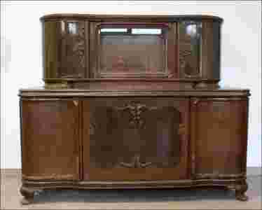 Kredens w stylu art deco. Charakterystyczne zdobienia dla stylu - duże czeczoty orzechowe na płycinach drzwiczek dekorowane na krawędziach snycerskimi zdobieniami. Nogi gięte, szyba fazowana. Lewa strona dolnej części mebla z dwiema szufladami, środkowa oraz prawa z półkami.