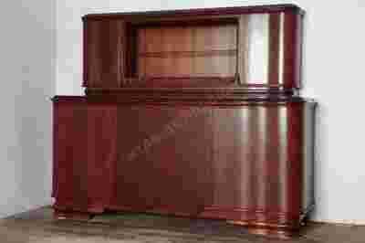 Mebel składa się z dwóch części, komody i nadstawki. Nadstawka posiada z obu stron schowki, z lewej strony barek z półeczką, którego wnętrze wyłożone jest płytami stiukowymi, z prawej schowek z półeczką. Zamki drzwiczek schowków sprawne, wnętrza czyste. Witryna z półką szklaną za suwanymi szybami (zdjęte do fotografii). Dół mebla to obszerna komoda, która za lewymi drzwiczkami posiada pięć szuflad, a wnętrze prawej strony, za podwójnymi drzwiczkami, podzielone jest na dwie części przez dużą półkę (półka nieorygionalna ze sklejki gr. 18mm). Pod blatem komody znajduje się wysuwany, dodatkowy blat o wymiarach 35 x 65 cm. Komoda jest rozbieralna, skręcana. Forma mebla zwarta, spoczywa na masywnych,wyprowadzonych piękną, falistą linią nogach, elegancji nadają mu dobre proporcje. Miękka, falista linia frontów, podkreślona kunsztownymi gzymsami i cokołami, powodują, że ten dosyć masywny mebel wygląda lekko. Oszczędne, snycerskie dekoracje roślinne dodatkowo podkreślają klasę mebla. Powierzchnia drzwiczek fornirowana czeczotą, wnętrza mahoniem. Stan mebla bardzo dobry, przeprowadzone były zabiegi restauratorskie ( widoczne delikatne ślady użytkowania).