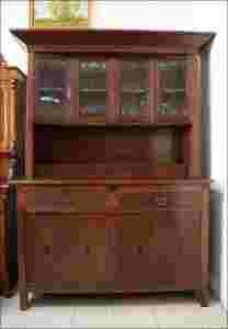 Dębowy kredens secesyjny z przełomu XIX/XXw. Drzwi mebla z delikatnymi intarsjami, oryginalne okucia z epoki. Nadstawka kredensu przeszklona. Kredens posiada wysuwany pomocnik w postaci drewnianego blatu.