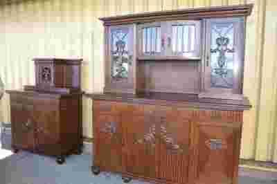 Przedmiotem aukcji jest antyczny komplet do jadalni dębowy kredens i pomocnik z lat międzywojennych.