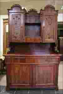 Klasycznych rozmiarów kredens z drugiej połowy XIX wieku. Mebel wykonany z mahoniu i mahoniem fornirowany. Mamy w swojej ofercie dwa podobne kredensy. Ten wyróżnia się od pozostałych charakterystycznymi dla eklektyzmu zdobieniami snycerskimi o motywach roślinnych na puncowanym tle. Zwieńczenie zaopatrzone w ażurową koronę na wszystkich szczytach mebla. Piękny przykład kredensu z okresu Ludwika Filipa.