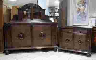 Komplet przedwojennych mebli dębowych - kredensu oraz pomocnika. Typowy przykład solidnych i jednocześnie estetycznych mebli do niekoniecznie dużego salonu. Kredens z relatywnie niewielką nadstawką zawierającą w sobie przeszkloną część. Skromne, aczkolwiek gustownie wkomponowane zdobienia w postaci medalionów na drzwiach oraz pionowych, bocznych listew - powielone na pomocniku. Nogi toczone oraz frezowane. Zamki oryginalne, komplet kluczy.