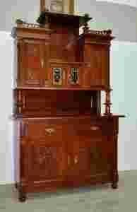 Zapraszam do zakupu pięknego kredensu. Powstał on na początku XX i wykonany jest z drewna okleinowanego orzechem. Kredens składa sie z dwudrzwiowego dołu oraz nadstawki wspartej na toczonych kolumnach. Mebel dekorowany za pomocą ornamentów roślinnych. W nadstawce w części środkowej znajduje się szfka z drzwiczkami przeszklonymi zielonym szkłem na które nałożone jest mosiężny ornament. Stan bardzo dobry po renowacji. Transport na terenie całego kraju do uzgodnienia.
