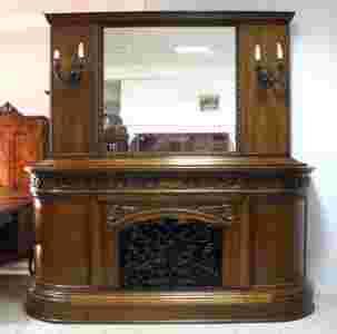 Takiego mebla jeszcze nie mieliśmy ... Niby kredens ale z olbrzymim lustrem, w dolnej części jednak znajduje się imitacja kominka, która wprawdzie nie grzeje ale dzięki podświetleniu sprawia bardzo realistyczne wrażenie i działając na wyobraźnię może spowodować, że mimo wszystko zrobi nam się cieplej. Teraz kilka faktów - mebel orzechowy, bardzo duży i bardzo ciężki. Snycerskie zdobienia bardzo wyważone, po bokach dolnej części dwie szafki z giętymi drzwiczkami. Drzwiczki kominka żeliwne z pięknymi, floralnymi zdobieniami. Nadstawka z olbrzymim lustrem oraz kandelabrami umieszczonymi po bokach. W tytule umieściliśmy informację, że mebel może być również barkiem - wystarczy wyjąć wkład kominka by mebel przekształcić w taki właśnie "niezbędnik"do mieszkania. Za kratami można umieścić trunki, a boczne szafki pomieszczą niezbędne szkło...