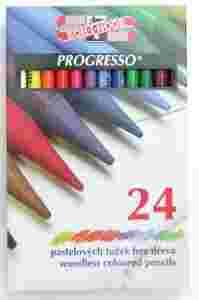 ROGRESSO to oryginalna i jedyna w swoim rodzaju kredka bezdrzewna. Wykonana w całości z kolorowego sztyftu, pokrytego bezbarwnym lakierem. Dzięki temu idealnie nadaje się do rysowania konturów, wypełniania dużych powierzchni jak i do wykonywania miękkich przejść pomiędzy kolorami i cieni. Dodatkowo strużyny powstałe przy temperowaniu mogą być użyte do cieniowania i wypełniania obszarów rysunku kolorem poprzez ich rozcieranie palcem lub rozcieraczem. Można je temperować w zwykłych temperówkach. Każda z kredek PROGRESSO posiada numeryczne oznaczenie koloru. Zestaw pakowany jest w kartonik z plastikową szufladką.