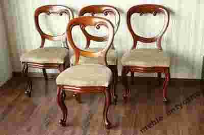 Komplet czterech krzeseł Biedermeier. Wykonane zostały z drewna mahoniowego. Materiał obiciowy welur, siedzisko na pasach. Krzesła charakteryzują się niebywałą elegancja. Stan Mebla jak na swój wiek jest bardzo dobry.