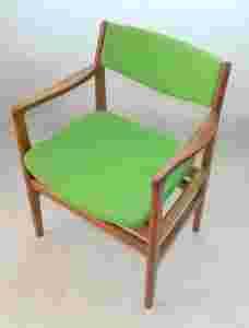Niezwykłe krzesło/ fotel z drewna tekowego. Wyprodukowany w latach 70-tych w Dani. Masyw tekowy pokryty politurą, tapicerka o zielonej ciekawej barwie. Oryginalny przykład skandynawskiego designu.