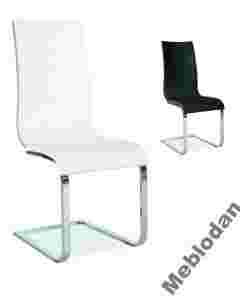 Krzesło na płozach z miękkim tapicerowanym siedziskiem i oparciem oraz metalowym stelażem.