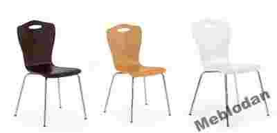 Krzesło z drewnianym siedziskiem wraz z oparciem, metalowym stelażem, uchwytem do podnoszenia i możliwością sztaplowania (piętrowania).