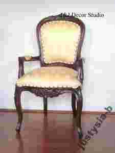 J&J Decor Studio zaprasza na aukcje! Przedmiotem aukcji są przepiękne krzesło-fotelik wykonane w całości z litego drzewa mahoniowego w kolorze ciemnobrązowym (ciemny kasztan delikatnie przechodzący w mahoń). Elegancja, szyk, klasyka. Lite drewno, tapicerka wykonana z eleganckiego materiału obiciowego. Krzesło jest są bardzo solidnie i precyzyjnie wykonane. Tapicerka jest uzupełniona złotymi nitami, co sprawia, że wyglądają one bardzo elegancko. Produkt jest nowy.