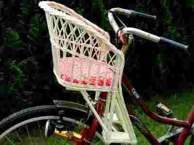 Fotelik na rower dla dziecka z białej naturalnej wikliny z poduszką na siedzisko - fotelik idealnie nadaje się na wycieczki rowerowe dzięki czemu stają się jeszcze bardziej przyjemne zarówno dla rodziców jak i dzieci. Bardzo solidna i stabilna konstrukcja zapewnia wożenie dziecka w bezpiecznej i wygodnej pozycji. Umieszcza się go na przedniej części kierownicy za pomocą metalowych odpowiednio wygiętych prętów zabezpieczonych specjalnym tworzywem sztucznym. Fotelik pasuje do każdego rodzaju kierownicy.
