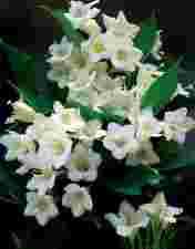 Kwitnienie: Na początku lata w kątach liści, na krótkich pędach bocznych, zawiązują się obficie pąki kwiatowe. Kwiaty dość duże, 3,5 cm śr., dzwonkowate ze zrośniętym do połowy kielichem, cylindryczne, 5-krotne, białe z widoczną żółta plamą w gardle, lekko błyszczące. Kwitnie białymi, licznymi kwiatami w VI.