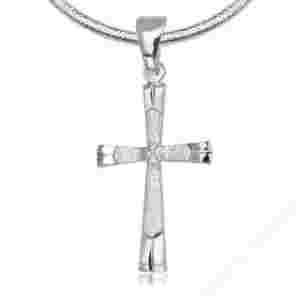 Srebrna zawieszka w kształcie krzyżyka. Prezentowany model wykonany z diamentowanego srebra próby 925.