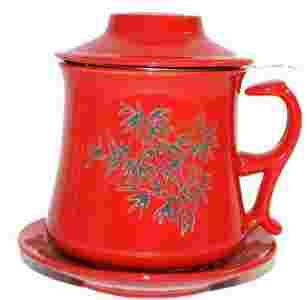 Elegancki porcelanowy kubek z filtrem, podstawką i pokrywką, z motywem roślinnym. Idealnie nadaje się do parzenia mieszanek owocowych oraz herbat naturalnych i aromatyzowanych. Zestaw zapakowany w pudełko ozdobne z motywem znajdującym się na kubku, doskonale nadaje się na prezent.