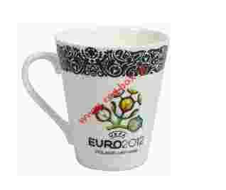 Kubek porcelanowy SKOŚNY z kolekcji EURO 2012. Kubek posiada logo EURO 2012 oraz ornament ze stadionami na czarnym tle. Pojemność kubka: 300ml. Wykonany jest z najwyższej jakości porcelany new bone china. Nadają się do mycia w zmywarce oraz używania w mikrofalówce. Idealne dla każdego kibica piłki nożnej podczas Mistrzostw Europy! Kubek zapakowany jest w kolorowy kartonik, a więc znakomicie nadaje się na prezent.