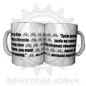 Biały kubek z rowerkami i cytatem Alberta Einsteina: "Life is like riding a bicycle. To keep your balance, you must keep moving" oraz polskim tłumaczeniem z drugiej strony: "Życie jest jak jazda na rowerze. Żeby utrzymać równowagę musisz się poruszać naprzód."