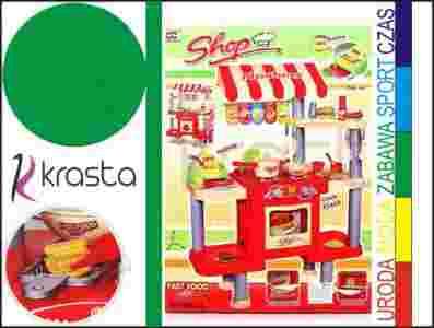 W zestawie jest też osobno miejsce do smażenia frytek z własnym pokrętłem. Dwupoziomowa zmywarka do zmycia wszystkich naczyń. Baldachim jak przystało na kulinarny stragan z jedzeniem, na którym można zawiesić ceny oferowanych produktów. Kasa fiskalna z pieniędzmi-wybierająca automatycznie sprzedawany produkt! Mnogość półeczek do układania gotowych dań. Zestaw ten zadowoli najbardziej wymagającego Kucharza, Restauratora.