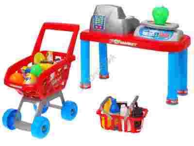 Fantastyczny pomysł na zabawę w dom, zakupy, sprzedaż. Poprzez zabawę w sklep dziecko może w łatwy i przyjemny sposób nauczyć się zasad robienia zakupów, wartości pieniądza itp. Dzieci uwielbiają edukacyjne zabawy, w których mogą naśladować dorosłych. Ten właśnie SUPERMARKET przeznaczony jest dla maluchów lubiących edukacyjne zabawy. W skład zestawu wchodzi: -blat z kasą fiskalną i wagą - wózek na zakupy - koszyk na zakupy - banknoty w nominale 5,10,25 $ - warzywa (kukurydza) - owoce (winogrono, pomarańcza, jabłko, egzotyczna karambola) - opakowania kartonowe imitujące lody, kawę, pizze, cukierki, jogurt, - opakowania plastikowe imitujące mleko, sok pomarańczowy, owoce w puszce Kasa posiada przycisk =, który otwiera szufladę z pieniędzmi, a przycisk z cenami powoduje obrót na wałku kasowym obrazka i ukazanie ceny za artykuł. Super STRAGAN WARZYWNO - SPOŻYWCZY do zabawy w sklep, bazar, dom. Spodoba się każdemu dziecku. Zestaw jest bardzo kolorowy wykonany z wysokiej jakości plastiku. Sprawi wiele radości małym przedsiębiorcom : ) Duży wybór asortymentu warzywno - owocowego zaspokoi wymagania każdego klienta. WYMIAR BLATU - wysokość 29cm - szerokość 16cm WYMIAR WÓZKA - wysokość do rączki 41cm - szerokość 20,5cm Zestaw zapakowany jest w śliczne kolorowe pudełko, idealnie nadające się na prezent.
