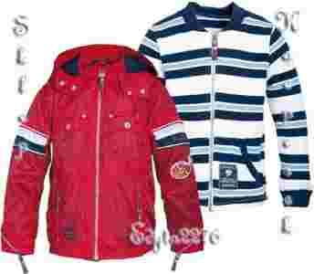 Kurtka jest typu 2w1 jest w kolorze bordowym z wykończeniami w kolorze białym i granatowym, wykonana jest z impregnowanego nylonu dzięki czemu jest nieprzemakalna.