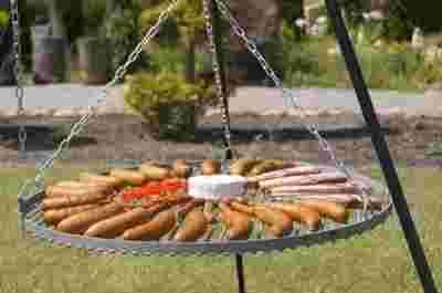 kompletny zestaw do przyrządzania posiłków nad ogniskiem. W zestawie ruszt, trójnóg oraz komplet ocynkowanych łańcuchów wraz z karabińczykami do zawieszenia rusztu.