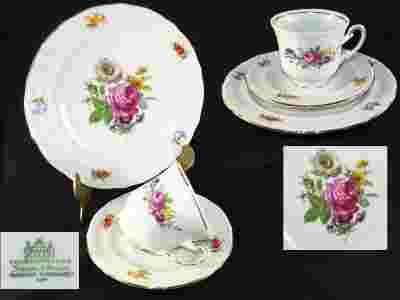 filiżanka składająca się z małego i deserowego talerzyka.Wykonana z wysokogatunkowej,białej porcelany.Zdobiona motywem dekoracyjnym w postaci cudownych kwiatów a całość podkreślona złoceniem.Piękna forma.Na uwagę zasługuje precyzja i jakość porcelany.Zachwyca blaskiem i urokiem.Sygnowana bardzo dobrą manufakturą porcelany VOHENSTARUSS.Polecam miłośnikom.
