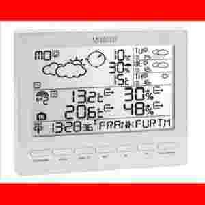 La Crosse WM 5300 STACJA METEOTRONIK - Stacja pogodowa z możliwością powieszenia na ścianie, lub postawienia na podstawce, prezentująca dane prognozy pogody pobierane drogą radiową oraz bieżące wartości temperatury i wilgotności z czujnika bezprzewodowego (warunki zewnętrzne) i wbudowane czujnika (warunki w pomieszczeniu). Stacja prezentuje prognozę dla 90 wyznaczonych stref w Europie, których wybór następuje poprzez wskazanie najbliższego z 470 predefiniowanych w urządzeniu miast. Dodatkowo istnieje możliwość wprowadzenia pięciu własnych definicji miast.