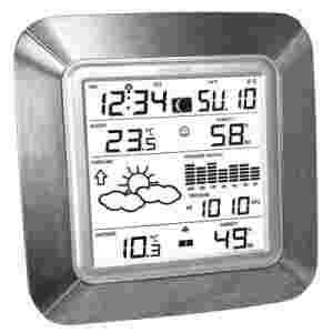 Stacja pogodowa wskazująca aktualny czas (synchronizowany DCF), datę, temperaturę wewnętrzną