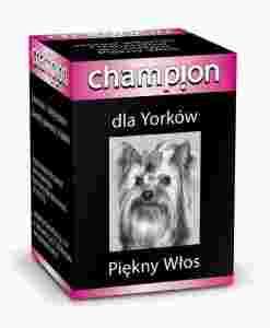 Preparat Champion Piękny Włos to zestaw witamin i minerałów opracowany specjalnie dla psów rasy Yorkshire Terier. Zawiera cynk, biotynę, kwas pantotenowy oraz witaminy A i E. Regularne stosowanie preparatu zapewnia Yorkom piękny błyszczący włos i zdrową skórę.